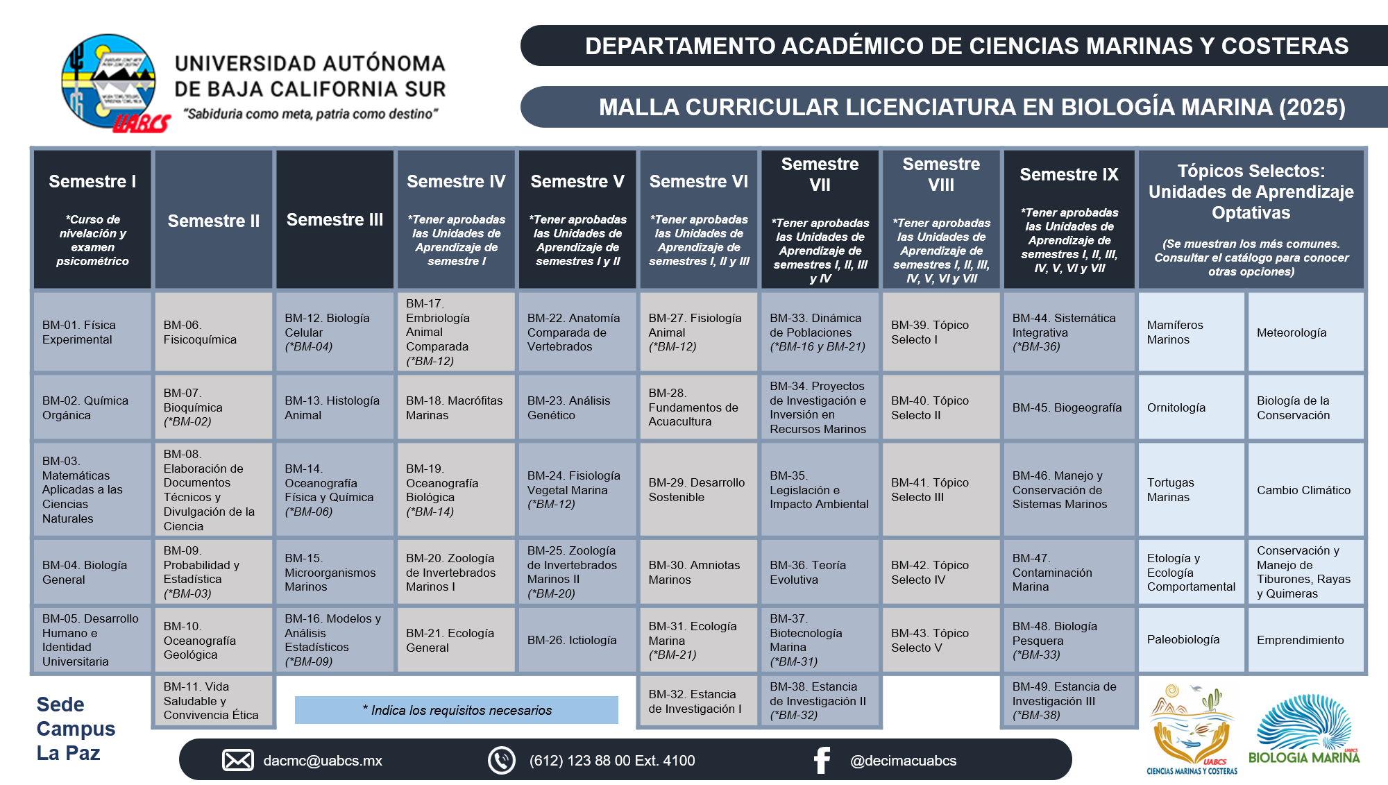 El Programa Educativo de Licenciatura en Biología Marina de la Universidad Autónoma de Baja California Sur es referente nacional e internacional por su calidad académica, pertinencia, enfoque social y evaluación continua, que incluye la formación integral de personas profesionales socialmente responsables, altamente capacitadas y con una visión humanística; ciudadanas íntegras y éticas para impulsar el desarrollo económico, político, social y cultural de su comunidad, teniendo como premisa el uso sostenible de los recursos naturales.