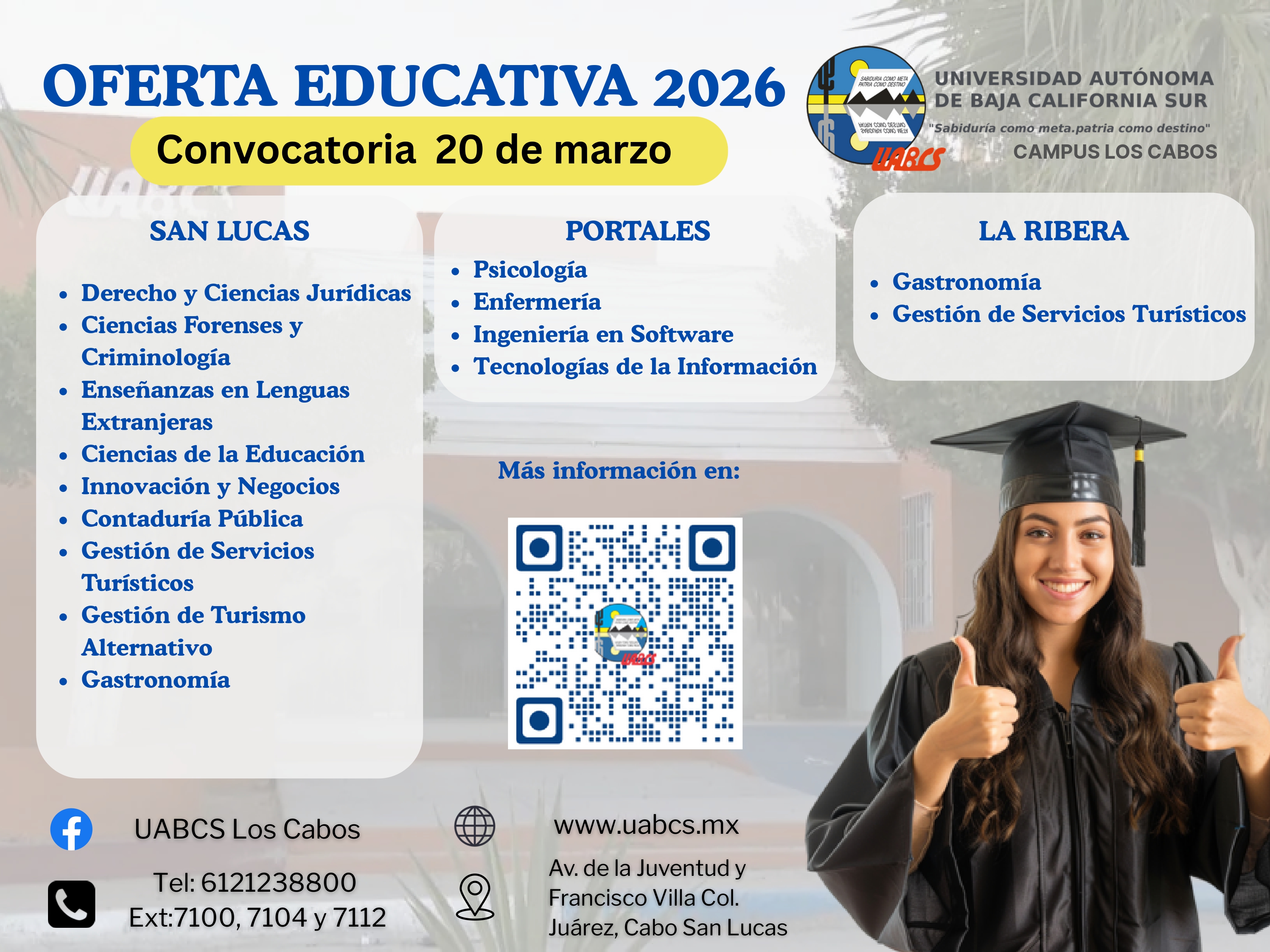 Somos la Universidad Autónoma de Baja California Sur, la institución de Educación Superior, con presencia en los cinco municipios del Estado. En esta región de Los Cabos, desde hace 21 años, hemos acompañado a la sociedad y durante este tiempo, se ha buscado en todo momento construir una formación de calidad a nuestros estudiantes; impulsar la investigación pertinente que dé soluciones; promover la extensión y divulgación de la cultura y a partir de la actual gestión, la responsabilidad social universitaria. Todas apuntando a sumar esfuerzos con muy diversos actores sociales en favor del Desarrollo humano Sustentable.